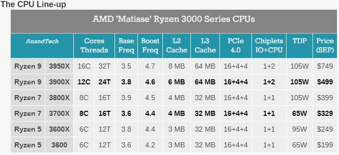 먼저 3700X는 8코어 16스레드, 베이스 3.6, 부스트 4.4의 동작 클럭과 32MB L3 캐시, TDP 65와트의 스펙으로 가격은 329달러