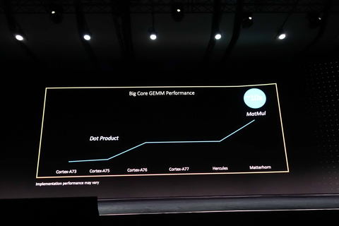 "기계 학습에서는 Cortex-A75/55에 닷 프로덕트 명령을(SIMD)에 도입했다. Cortex-A76에서는 성능을 2배로 올렸다. 그리고 Hercules 후 세대가 되는 Matterhorn에서는 k, 새로운 명령을 아키텍처에 도입한다. 매트릭스 곱셈(Matrix Multiply), 『 MatMul』라고 부르는 명령으로 CPU의 성능이 더 많이 오른다"고 Smythe는 말한다.